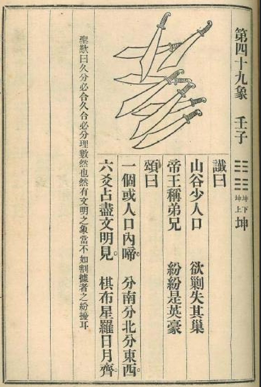 “六爻占尽文明见”:八卦中最后一卦是坤卦,此象的卦象也是坤,就是说此时战争结束和平时期到来了。